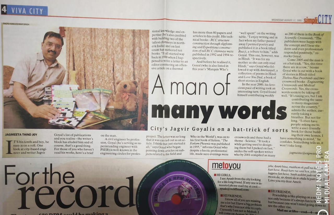 The Punjab State Electricity Board has appreciated the services of its engineer, Mr Jagvir Goyal and has awarded him with a prize of Rs 10,000 and a commendation letter for outstanding work in the field of civil engineering. At a relatively young age of 36, Mr Jagvir Goyal has already written two highly technical and voluminous books on advanced subjects like "Slip forming" and Expeditious construction of tall RCC Chimneys".