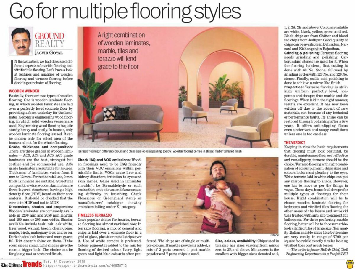 In the last article, we had discussed different aspects of marble flooring and vitrified tile flooring. Let’s have a look at features and qualities of wooden flooring and terrazzo flooring before deciding our choice of flooring