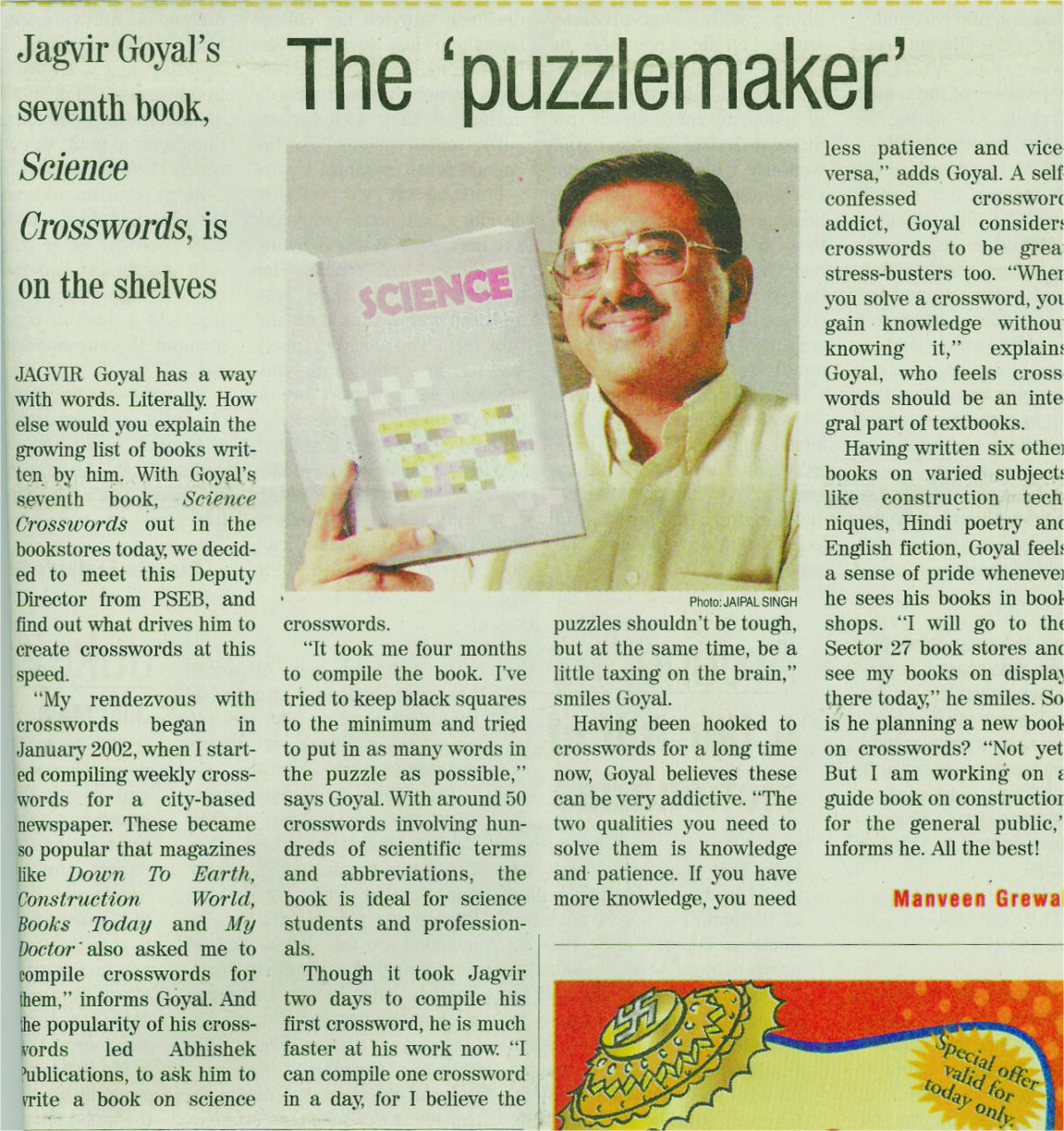 Jagvir Goyal has a way with words. Literally. How else would you explain the growing list of books written by him. With Goyal’s seventh book, Science Crosswords out in the bookstores today, we decided to meet this Deputy Director from PSEB, and find out what drives him to create crosswords at this speed.